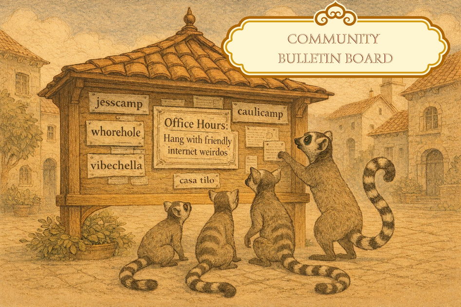 Hearing about a vibecamp newsletter after the fact? Your copy lost in an aggressive spam filter? We've got you covered! If you aren't subscribed to the newsletter you can do that above (if you don't see a link, try switching to chrome!) And if you have something you want us to consider adding to our calendar or future newsletters, use this form.